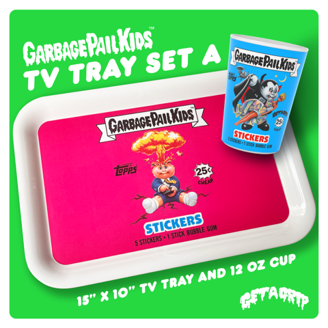 We promised everyone who couldn’t attend Gross Con in person, some fun online exclusives and today marks the first drop. Tune in tomorrow and Sunday, same time, same place. First up is this Official Garbage Pail Kids Adam Bomb TV Tray and Nasty Nick Cup.